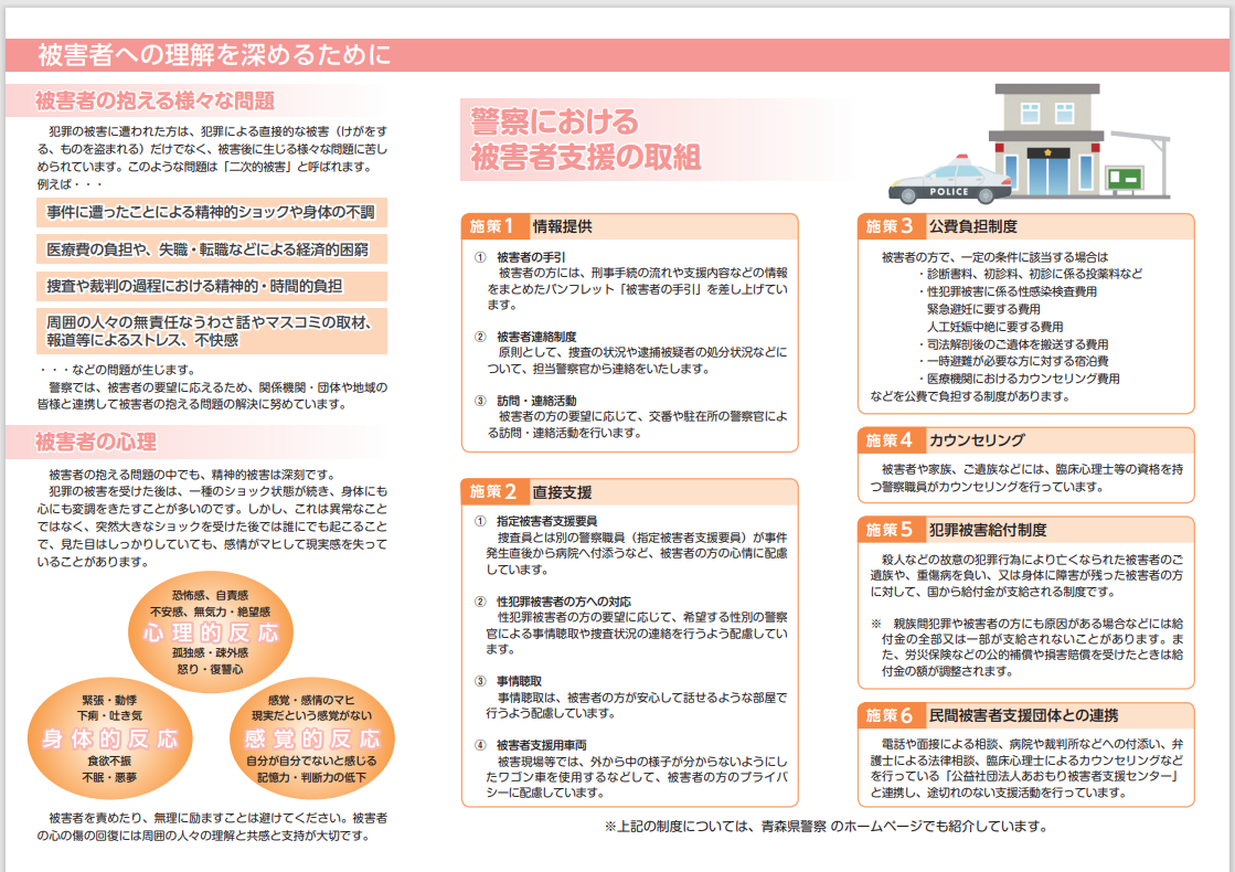 殺人事件、重傷を負った傷害事件及び性犯罪事件などの被害にあった人とそのご家族、交通事故で亡くなられた人のご遺族、ひき逃げ事件の被害者及び重傷を負われた人などに、刑事手続の流れや各種支援内容をまとめたパンフレット「被害者の手引」を差し上げています。