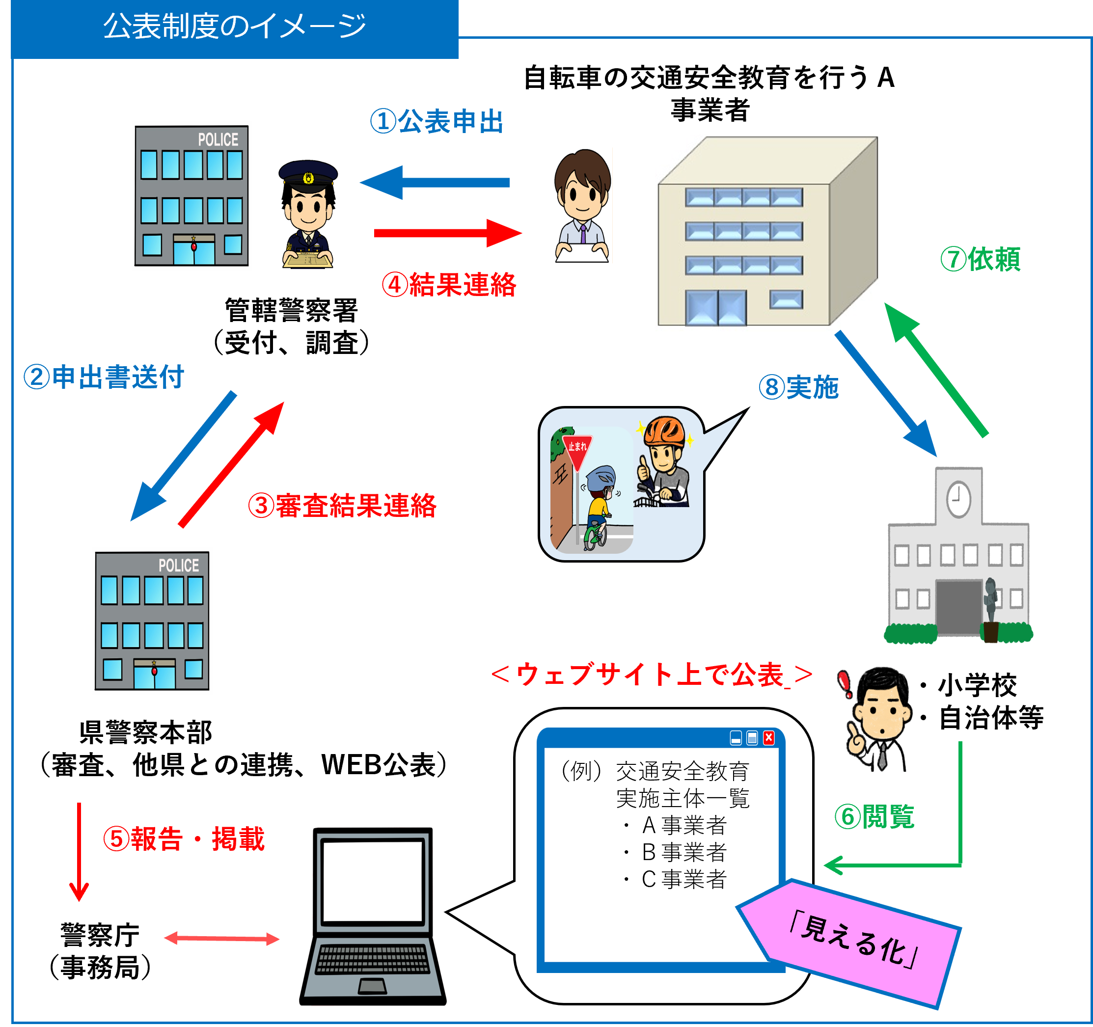 「自転車の交通安全教育実施事業者公表制度」は、専門的な知見を有する自転車の交通安全教育実施事業者を、警察において公表する制度です。