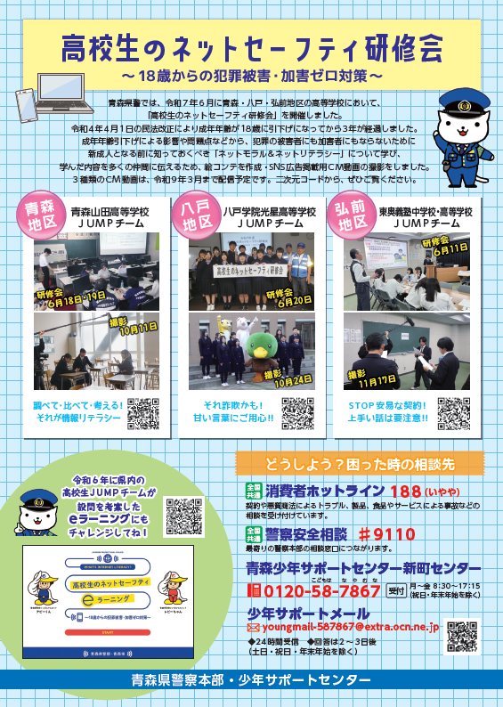 「令和7年度高校生のネットセーフティ研修会」チラシです。研修会の内容や成年年齢引下げによる影響などについてまとめたチラシを作成しました。
